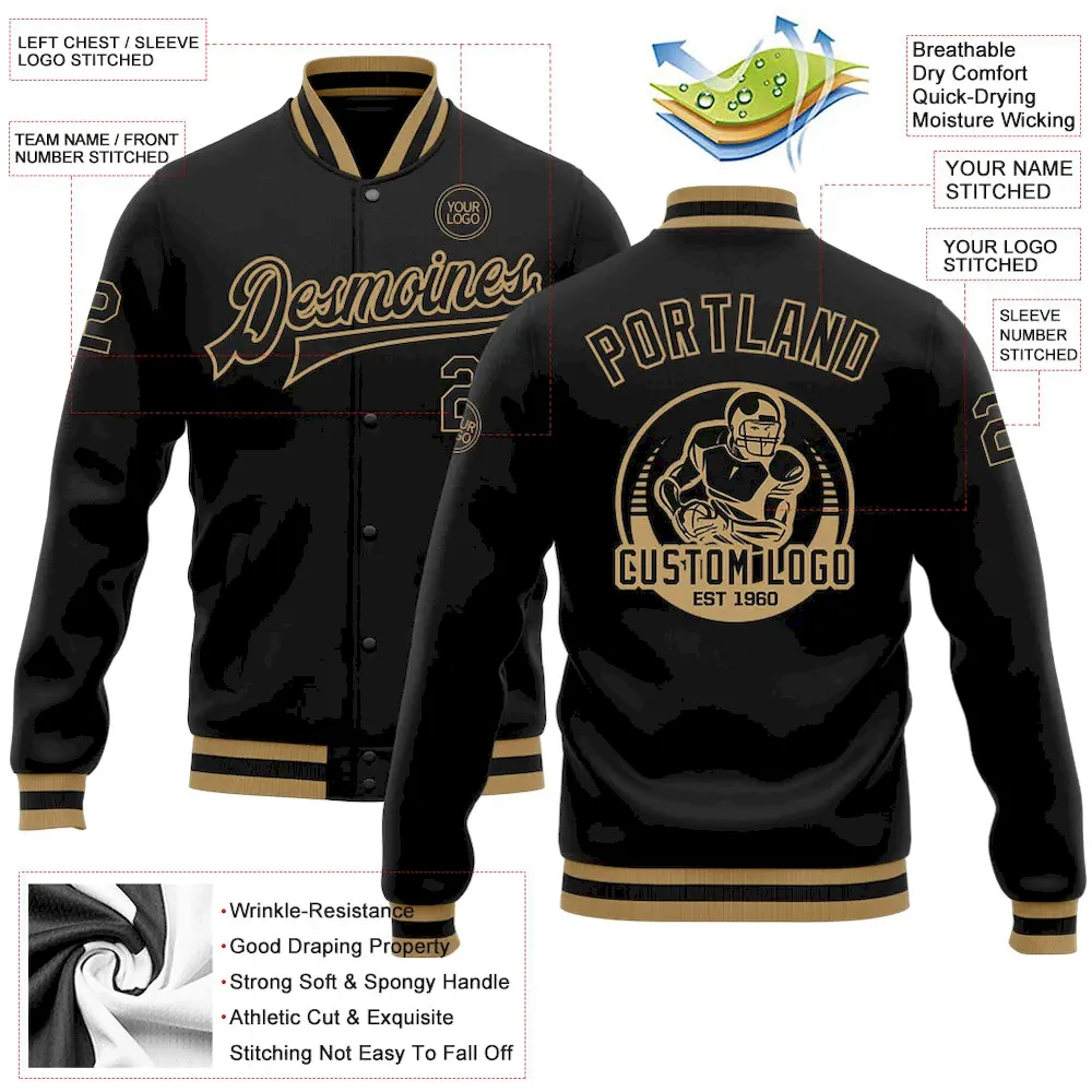 Custom Black Black-Old Gold Bomber Full-Snap Varsity Letterman Jacket