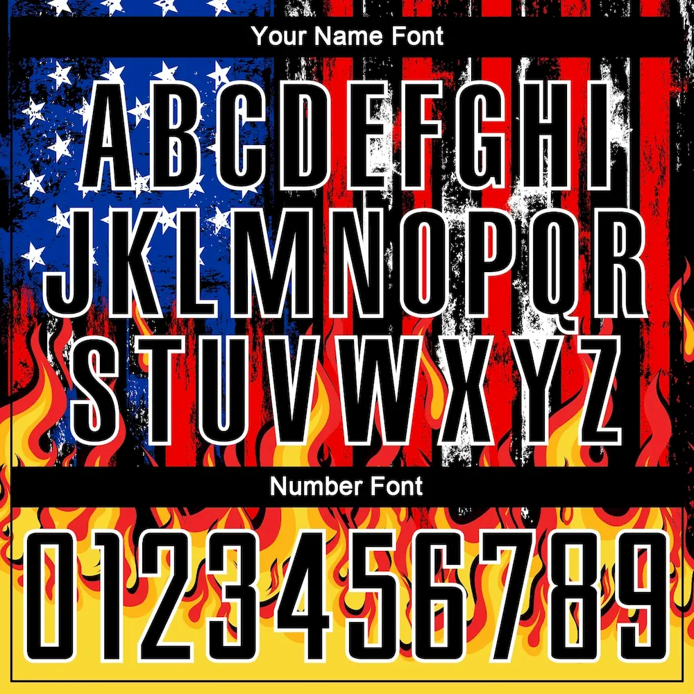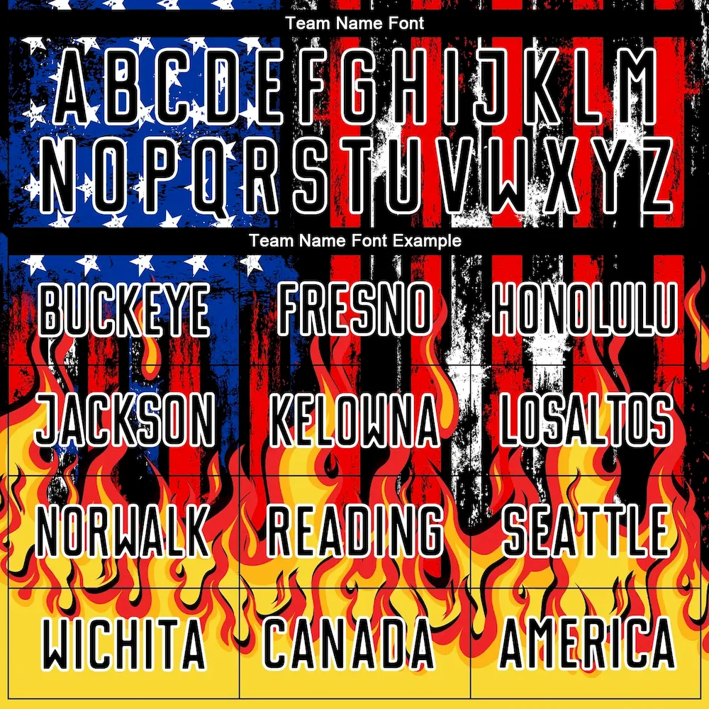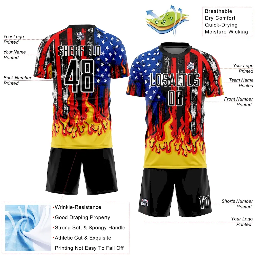 Custom Black Red Royal-Gold American Flag Flame Sublimation Soccer Uniform Jersey