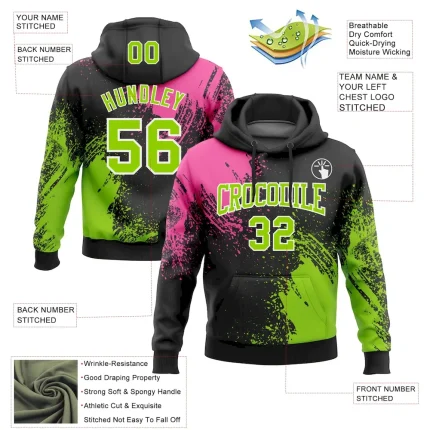 Custom Stitched Black Neon Green-Pink 3D Pattern Design Abstract Brush Stroke Sports Pullover Sweatshirt Hoodie
