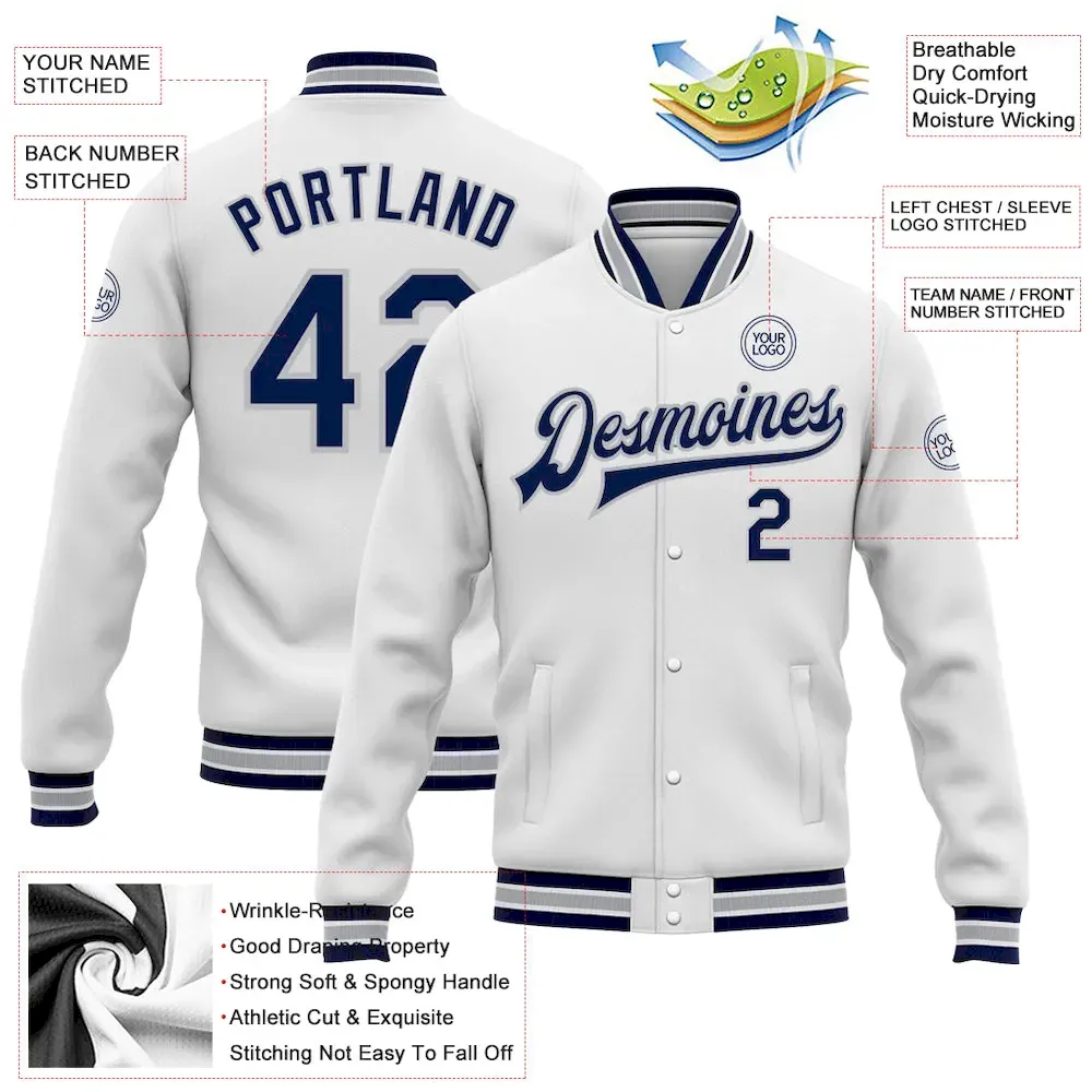 Custom White Navy-Gray Bomber Full-Snap Varsity Letterman Jacket